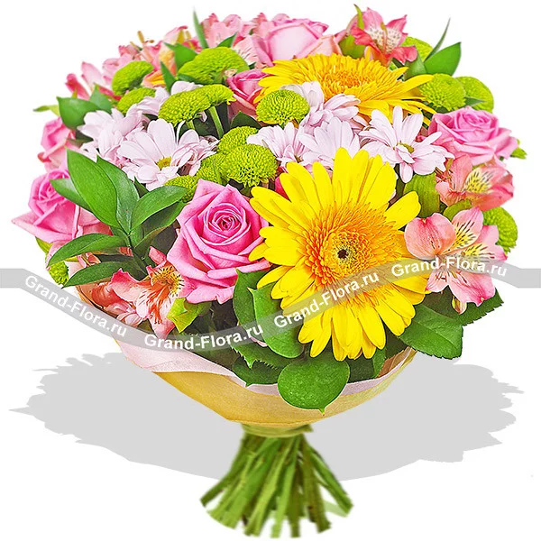 ДЕЛЮКС: роза розовая - 15 шт, гербера желтая - 6 шт, альстромерия розовая - 6 шт, хризантема кустовая зеленая - 5 шт, хризантема кустовая светлая - 4 шт, рускус, фетр желтый. Примерный размер: 45Х45 см.