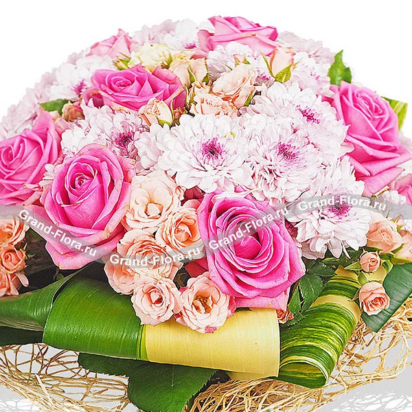 Уменьшенный: роза розовая - 3 шт, роза кустовая розовая - 2 шт, хризантема кустовая светло-фиолетовая - 3 шт, лист аспидистры загнутый - 3 шт, упаковка натуральная. Диаметр букета 40х40 см.